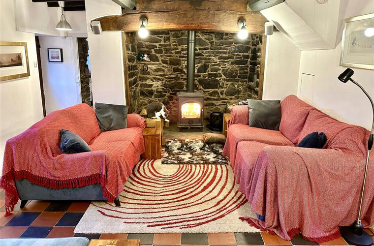 Sitting Room with log burner in large stone inglenook with oak beam over & light, beamed ceiling, staircase to first floor, quarry tiled floor, open through to