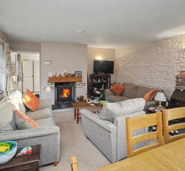 Open fireplace housing a wood burner. Radiator. Television point. Staircase to first floor. Door to rear garden.