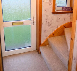 UPVC glazed door. Window to front. Fitted carpet. Carpeted stair to upper landing. Access to hallway via wooden door with glazed panel.