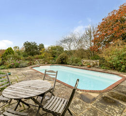 To the front of the property there are more formal gardens with the main space to the west of the house, where an outdoor swimming pool is enclosed within a terrace and well-established borders, inset within a generous lawn. The beautifully landscaped area around the pool and its terrace is perfect for entertaining alfresco in the warmer months, shielded from view by a variety of trees around the boundary.