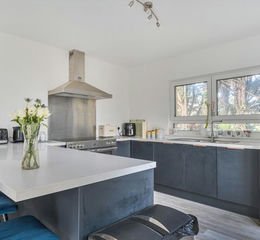 The triple aspect kitchen/breakfast room is a lovely bright space with double doors leading out to the garden. The kitchen has been fitted with modern units with stone worktops including a breakfast bar. Appliances include a range-style cooker with extractor over, integral dishwasher, and space for an American-style fridge/freezer.