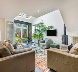 24' 9" x 21' 10" Narrowing to 10'9" (7.55m x 6.65m narrowing to 3.29m) L shaped: Bi-folding doors opening onto the rear garden with floor to ceiling windows to the side with a vaulted ceiling, Velux windows, 'Hwan' pedestal wood burning stove with exposed flue, tiled flooring, chrome power points and switches, radiators, TV aerial point, down lights, wall lights, up lights, inset ceiling speakers, stairs to first floor with chrome hand rail and glass balustrade with under stairs storage cupboard.