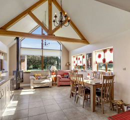 Larkrise is a well-presented, four bedroom family home with a wealth of reception space, occupying formals gardens and standing alongside three paddocks and a stable block (the plot totalling approx. 2.4 acres, sts). Offering potential purchasers a lifestyle change, with views across the gardens or paddock from most rooms, Larkrise enoys versatile spaces throughout. Having been extended over a number of years, the property is currently configured with large dining and sitting rooms off a reception hall space, plus conservatory; kitchen, boot room and utility to the ground floor – which is also home to a master bedroom suite, guest bedroom and family bathroom. The first floor provides two further bedrooms, both with adjacent shower rooms. A large double garage, and workshop, sit to one side of the double-ended driveway, which also leads across the front of the property.