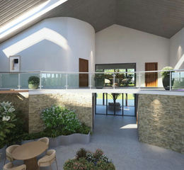 A second internal garden atrium is overlooked by a sweeping internal balcony and staircases, while expansive glazing frames the surrounding countryside. The 0.5-acre plot offers scope for landscaped gardens, terraces, and ample parking — perfectly suited to both family living and entertaining at scale.