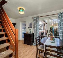 Dining Room - 4.55m x 2.62m (14'11 x 8'7) - Central heating radiator, wood effect laminate flooring, single glazed door to kitchen, oak open staircase to first floor and UPVC double glazed French doors to rear.