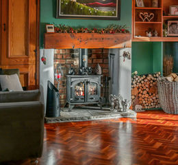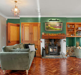 The main lounge features Rhodesian teak parquet flooring and a wood burning stove set within a fireplace constructed by the owner using an oak beam and shaped surrounds.