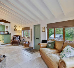 The farmhouse-style kitchen is fitted with a range of shaker units arranged in an L-shape, complemented by black granite worktops, exposed oak beams and a rooflight providing excellent natural light. Appliances include a Rangemaster-style Nexus cooker with induction hob and oven, integrated microwave, Neff dishwasher and space for an American-style fridge/freezer. The kitchen opens through to a dining area with stained solid oak flooring creating a open and sociable space.