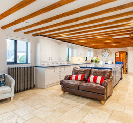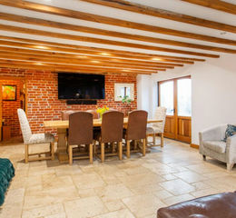 Flowing from the kitchen, the main living room is rich in character, featuring exposed brickwork, timber beams and an open fireplace with log burner. Large doors open directly onto the garden, allowing natural light to flood in and offering a seamless connection between indoor and outdoor spaces.
