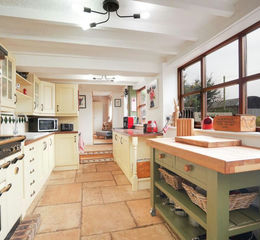 A further separate dining area is positioned adjacent to the breakfast kitchen with flagstone floor and Shaker, country style fitted units with under cupboard lighting, enamelled sink unit and solid wood work tops. The kitchen is complete with Rangemaster double oven with five gas hobs set within the brick chimney breast. The fitted utility is accessed from the rear hallway with fitted units including a plumbing for appliances, and sky light. The rear hallway has a useful pantry and a door leading to the rear garden.