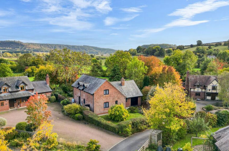 Outside, the property is approached via a large driveway offering ample parking, leading to an integral garage. The rear garden is a particular feature, offering a large decked terrace ideal for entertaining, together with lawns, mature trees, and well-stocked borders. The gardens back onto the private communal parkland extending to around four acres, with open countryside and the rolling Herefordshire hills beyond.