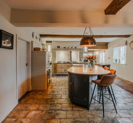 While there is a formal front entrance, the natural arrival - true to the house’s farming heritage - is from the rear. A practical porch provides space for muddy boots before leading directly into the heart of the home: the kitchen dining room. Full of character and warmth, this space is centred around a beautifully crafted island with soft, rounded edges and Home Farm House etched into the wooden worktop. Old and new sit effortlessly together here, with a sleek, professional-quality kitchen by locally renowned Kitchens Etc set against the original pamment tiled floor. Exposed brickwork, revealing the outline of a long-closed window, and ancient beams overhead quietly tell the story of the house’s past.