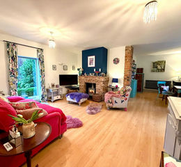 Adjoining the kitchen is the open plan lounge and dining room. This is a generously proportioned reception space with three windows providing excellent natural light throughout the day. A brick-built log-burning stove forms a central focal point, creating warmth and character, particularly during the winter months. This room comfortably accommodates both seating and dining furniture.