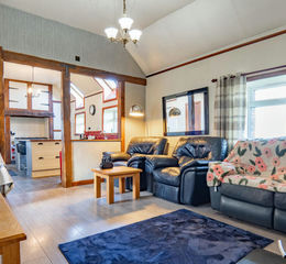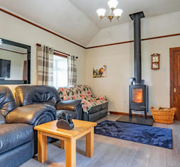 Through a wide opening, the living area connects seamlessly with the kitchen. A freestanding wood burning stove sits proudly at the centre of the room, drawing you in and providing warmth during colder months. Light coloured walls, timber detailing and soft grey flooring keep the space calm and comfortable, with plenty of room for a full sofa arrangement. A large window brings in countryside light, balanced by a substantial radiator on the opposite wall.
