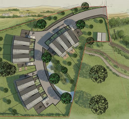 The proposed scheme presently comprises 9 dwellings with gardens, parking and access (100% open market). It will be accessed off of the existing access road with a new internal estate road.