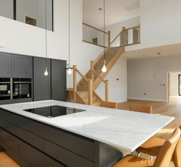 There are integrated fridge and freezer units as well as a NEFF oven, microwave, and warming draw. The kitchen also includes an integrated dishwasher, wine fridge, Quooker tap for boiling water, and a state-of-the-art NEFF induction hob unit with central extractor. Sliding bifold doors overlook the gardens and there is a central oak staircase with feature glass balustrade.