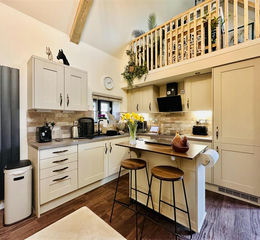 Lounge/Diner/Kitchen - 3.66m x 4.57m shortest or 6.25m longest (12'69 x 1 - The cottage is accessed through a solid wood door opening to a fabulous open plan living / dining / kitchen room, with vaulted beamed ceiling and mezzanine floor / office / temporary bedroom, which is reached by a pull down staircase. A hardwood double-glazed window to the front kitchen area and wooden double-glazed French doors leading out to the rear terrace and alfresco dining area, two Velux windows, vinyl flooring. There are fantastic ceiling and wall lights, there is a mains smoke alarm, two graphite radiators.