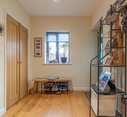 This truly impressive room is perfect for those who love to entertain or indeed are searching for plenty of space for visiting friends and family. To the rear of the room lies the sitting area, perfectly positioned for soaking up the spectacular views, with bi-folding doors effortlessly flowing out to the garden. There is plenty of room to either the middle of side of the room for a large family size dining table which neatly separates the living space from the kitchen. The kitchen is a chic contemporary affair with quality wall and base units, a superb island unit with a breakfast bar and numerous integrated appliances, included fridge/freezer, oven and hob, dishwasher and wine fridge, along with space for a washing machine. The kitchen and island feature a smart marble counter top aspect, matching oak finished laminate flooring with under-floor heating as in the hallway. There is flat ceiling to the kitchen area which contrasts with a shallow vaulted ceiling over the living area. The dual aspect room features Upvc double glazed windows to one side and as previously mentioned a glass wall to the rear including bi-folding doors.