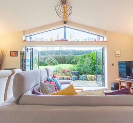 To the rear of the house is an exceptional dual aspect, open plan, living/kitchen/dining room, a stunning room showered with natural light from the impressive glass wall which features bi-folding full width doors with a feature triangular transom window over, the glass wall quite literally frames the equally exceptional outlook over the south facing garden and countryside beyond.