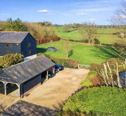 Set within an approximate one-acre plot, this exceptional detached Grade II listed barn offers a superb balance of historic character and refined contemporary living, surrounded by open countryside and far-reaching rural views. Beautifully appointed throughout, the property displays an abundance of exposed beams and original features, seamlessly complemented by high-quality finishes. The ground floor accommodation is both generous and versatile, featuring a stunning rear living room enjoying uninterrupted views over the garden, and an impressive central dining hall with dramatic vaulted ceilings and a feature wood-burning stove. Further ground floor highlights include a beautifully appointed kitchen/dining room, separate utility room, cloakroom, additional reception room, and a study ideal for home working. A well-proportioned ground floor bedroom with en-suite shower room completes the accommodation on this level. The first floor is a particularly notable feature, accessed via two independent staircases forming a galleried landing overlooking the dining hall. One wing is dedicated to the luxurious principal suite, complete with a stunning en-suite bathroom, while the second wing provides three further bedrooms, an additional en-suite, and a family bathroom. Externally, the property enjoys a private and secluded setting, with beautifully maintained grounds, carport and driveway parking, and uninterrupted views across rolling countryside, offering a true sense of tranquillity and exclusivity.