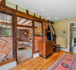 A glazed and panelled door opens to the inviting reception hall which has Karndean flooring, attractive open stud work with herringbone brick infill to the side wall, and doors leading to the inner hall and off to the principal reception rooms. The dining room is situated to the front of the property and benefits from a dual aspect overlooking the grounds, and has a wonderful exposed oak frame on display, an impressive inglenook fireplace with a herringbone hearth and leaded windows looking back to the reception hall. A solid oak ledge and board door accesses the front entrance lobby with an adjacent door going to the drawing room. The drawing room is situated to the front elevation of the property with a dual aspect and also has wonderful views to the grounds and countryside beyond. There are impressive oak timbers on display to the walls and ceiling and a particularly impressive inglenook fireplace with a herringbone hearth, and an inset wood burning stove. Beyond this, to the rear of the property is a useful study which has oak flooring and views to the garden.