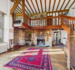 One enters the house via the large porch, into the impressive part vaulted, galleried reception hall, with a wide oak staircase leading up and round to the landing, and a vast, floor to vaulted ceiling, sandstone open fireplace and wooden flooring.