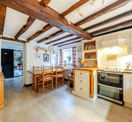 To the right of the hall, the dual aspect dining or family room features an original inglenook fireplace with an inset log burning stove. This room connects to the farmhouse kitchen which is fitted with a comprehensive range of base and wall unit including a larder-style cupboard with wicker baskets and plate rack. Completing the farmhouse feel there is a butler sink unit, granite work tops and ceramic tiled splash backs. Appliances include a built-in dishwasher and electric cooker with extractor over.