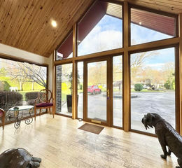 The gardens are a standout feature — extensive, established and exceptionally private. They are predominantly laid to lawn with patio areas, mature trees and well-stocked planting. A large driveway provides parking for multiple vehicles and leads to two substantial garages, together offering potential for up to four cars.