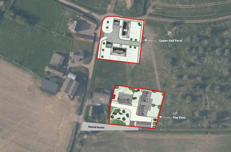 The two sites are known as 'The Elms' and 'Upper Hall Farm' and currently comprise two sets of agricultural buildings 50 metres apart. Both are relatively flat and benefit from direct access to the C1196 to the west, with a traditional orchard to the east and arable fields to the north and south.