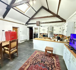 Kitchen / Dining Room - 5.56m x 5.03m (18'3" x 16'6") - This really is the heart of this lovely home with an open vaulted ceiling having exposed A frames, two Velux roof windows, tiled flooring, bespoke kitchen units incorporating single drainage sink unit, double oven, hob and breakfast bar. Front door to front porch. French doors to side utility/conservatory.