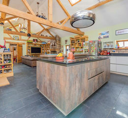 Open Plan Living/Dining/Kitchen: This stunning space is perfect for those who love entertaining and cooking. The room boasts a high vaulted ceiling with exposed beams and trusses and is flooded with natural light from multiple Velux roof lights. The living and dining area features double French doors with full-height glazed side panels, opening onto the paved sun terrace—ideal for alfresco dining. A brick chimney breast houses a cast iron log burner set on a raised slate hearth, with fitted media and display shelving to the side.