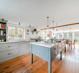The stunning triple aspect kitchen/dining room spans the rear of the house. Fitted with bespoke Woodwork shaker style cabinetry under marble worktops with a beautiful copper sink, large island unit and an Aga, the space then has a “garden room” style dining area with a vaulted glass ceiling and French doors out to the rear terrace with pretty garden outlooks.