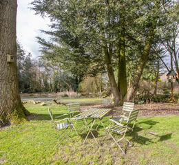 The landscape is dotted with two serene ponds, while a gentle stream adds another tranquil sound to the atmosphere. Secluded areas are thoughtfully integrated, creating perfect spots for quiet reflection or intimate gatherings, whether you're seeking peaceful moments alone or hosting garden events.