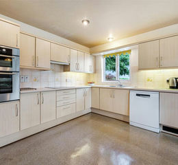 Steps lead down from the inner hall to a generous open-plan kitchen and dining area. Fitted with wall and base units to two sides, the kitchen offers excellent storage and ample workspace. Integral appliances include a double oven, electric hob, fridge, and a designated point for a dishwasher. This space enjoys pleasant outlooks to both the side and rear of the property.