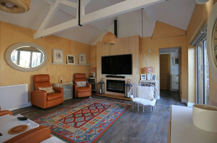 Living Room Area: 6.20m (20'4) x 4.30m(14'1) Window to side. Bifold door. Media wall with space for a 65 inch television. Electric fan/flame effect fire (Flue in place for optional wood burning stove - subject to regulations) Two electric radiators. Vaulted ceiling with beams. Birch wood wall panelling. Flooring continues from kitchen. Spiral staircase to mezzanine: