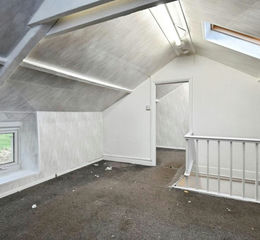 Vaulted ceiling, skylight to rear, window to front, carpeted flooring, ceiling light, door into:-