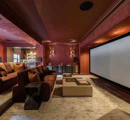 A connecting lobby from the reception hall leads through to the cinema room. A large projector screen sits to one wall with double row seating, perfect for hosting movie night with friends. To the corner there is a cocktail bar with barstools, illuminated shelving, fridge, dishwasher and draught ale hand pump.