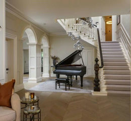 Considerable thought and expense have been invested in the redesign of the ground floor's reception rooms. Both the drawing room and dining room are grand in scale, with expansive bay windows framing views to the south and over the wonderful, landscaped gardens.