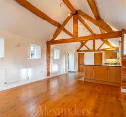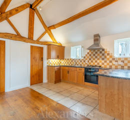 Accommodation: - Internally, the property showcases a wealth of original features throughout its impressive circa 1,105 square feet of accommodation, including a striking pitched and beamed ceiling, exposed brick columns, inset wall beams, numerous dual-aspect windows, and solid oak flooring. The generously proportioned layout centres around a large entrance hall leading into the triple-aspect open-plan kitchen/diner/lounge. The kitchen is fitted with a range of matching oak base units set to three walls, with granite work surfaces, a double breakfast bar, inset one-and-a-half stainless steel sink with mixer tap, and space for appliances. Windows to the front, side and rear elevations provide excellent natural light to the living space. A separate utility room offers additional storage, with space and plumbing for laundry appliances.