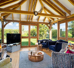 Next to the boot room door at the far end of the kitchen is the spacious dining area with its exposed brick opening enticing you through towards the large and welcoming expanse of natural light, glass and exposed timber beams that construct the Oak Room. A splendid triple aspect room with French doors on every side and panoramic views of the garden. The vaulted ceiling, log burner and underfloor heating make this room a real year-round living space, be it cosy winter nights stargazing by the fire or summer barbecues on the patio.