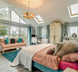 Upstairs, every bedroom is a true double, offering flexibility as children grow or needs change. The principal suite is a real retreat: vaulted ceilings create a sense of space and calm, while the private balcony invites quiet moments overlooking the surrounding countryside. A walk-in wardrobe and en-suite complete a space that feels more like a boutique hotel than a traditional cottage.