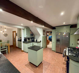 The farmhouse style kitchen diner provides ample worktop and storage space with a free standing range , complemented by a well-positioned utility area that keeps the laundry appliances away from the main kitchen. To the front of the room is dining space with windows to both the front and side elevations, allowing natural light to flood in.