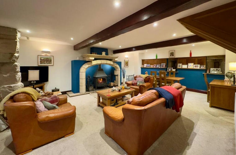 Entering through the front porch,the inner hallway has the staircase leading to the first floor ,stepping left into the main reception room. This impressive room boasts a striking multi-fuel burner set within a large stone feature fireplace beamed ceiling and exposed stonework features. The living room offers excellent versatility, comfortably accommodating lounge furniture, a dining table and even a home-working area. Original mullion windows to the rear further enhance the character of this space.