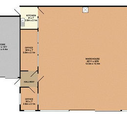 The principal building measures 12.5m deep x 14.5m wide (181.25sqm/1,950sqft) to include the workshop, two offices and a kitchenette. 4.6m to the ridge height. Sliding doors to the front.