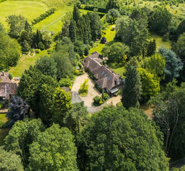 Immediately behind the property is an enclosed lawned garden with a patio terrace adjoining the house, accessible via doors from the sitting room and dining room, ideal for dogs and children. The grounds feature a rich variety of specimen trees, including ancient oaks and larch, willow, maple, copper beech and many others, as well as a beautiful collection of flowering shrubs such as rhododendrons. To the left, the garden becomes more formal, with a wide lawn flanked by colourful borders, a pergola walkway, and a small orchard at the far end. The remainder of the land is mainly laid to lawn, with a wildflower meadow creating a naturalistic finish.
