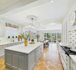 Kitchen - Open plan in style through to the main living area. Having an extensive range of high quality hand painted units with grand island and quartz worksurfaces. There are twin undercounter sinks with Quooker instant hot water tap, housing for a fridge freezer and the focal point is a gas fired twin hot plate AGA. There is also a wine chiller, dishwasher and Amtico flooring.
