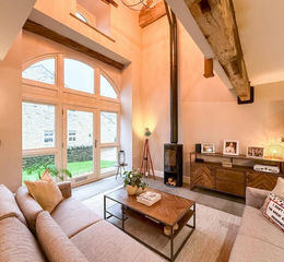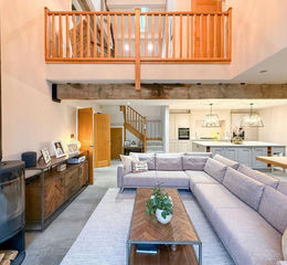 The main area offers a wonderful combination of spaces for relaxation, formal and informal dining, food preparation and entertaining. There's even a wood burning stove and vaulted double height ceiling, as well as turned staircase rising to the first floor galleried landing.