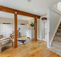 The accommodation briefly comprises an impressive reception dining hall with exposed oak pillars, creating a wonderful sense of space and warmth. Double doors open into a spacious living room, complete with a log burner set within an exposed brick chimney breast, and further double doors lead out to the side garden.