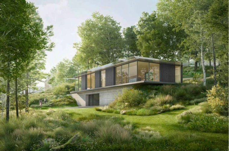 - Vertical black timber cladding, wildflower roofs and rammed cement walls
