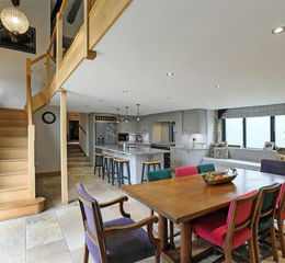 Continuing into the kitchen diner, the heart of the home. The ceramic tiled flooring with underfloor heating continues and exposed stone feature walls add character, while dual aspect windows flood the space with natural light. An open solid timber staircase with glazed balustrade rise to the first-floor landing and accommodation. The bar features a granite work surface, complemented by an under-counter wine fridge and ample drawer and cupboard storage. A set of timber French doors open to the Indian stone terrace, providing the perfect space for alfresco dining and entertaining guests.