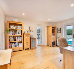To the left of the hallway sits a generous STUDY or home office, perfectly positioned for those working from home or in need of a quiet reading or hobby room. Finished again with engineered oak flooring and downlighters, the room enjoys a front-aspect window and double doors opening to the rear, creating a calm and productive space. An inner door leads through to the pool room, further enhancing its versatility.